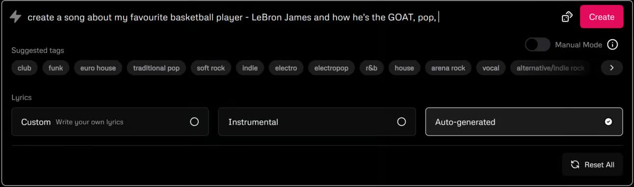 After creating your account, click the prompt box at the top of your screen and describe your song. Use prompt like: “create a song about my favourite basketball player. LeBron james and how he is GOAT, pop”