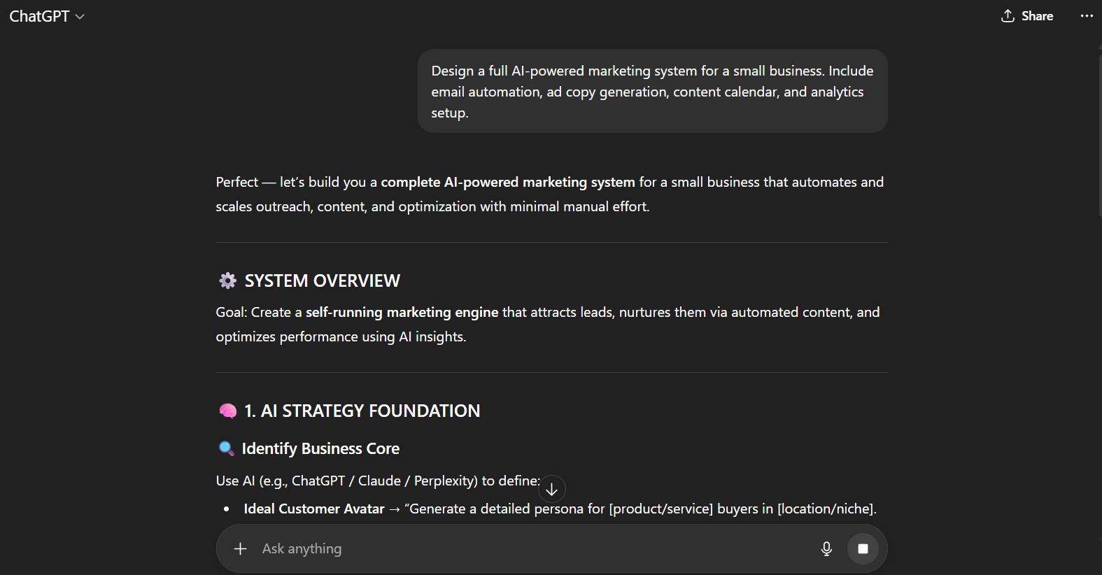 “Design a full AI-powered marketing system for a small business. Include email automation, ad copy generation, content calendar, and analytics setup.”
