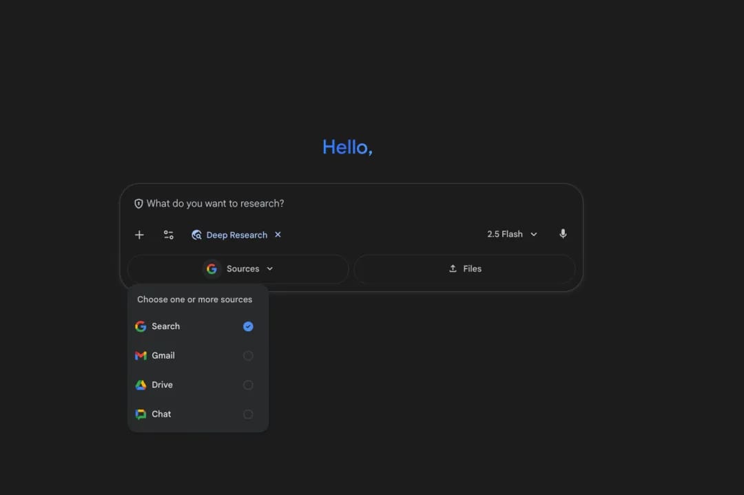 Deep Research can pull relevant info from Gmail, Google Drive, and Chat to give more accurate, personalized responses 💬
