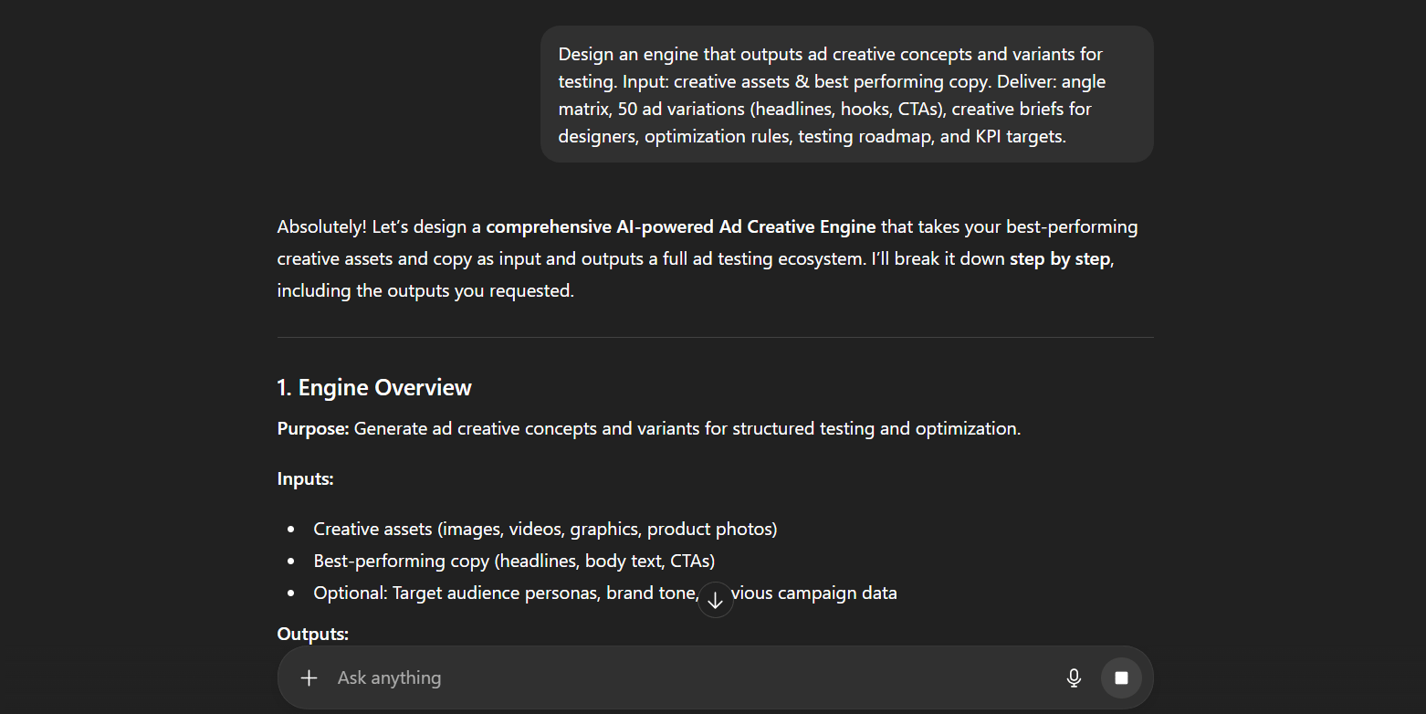 “Design an engine that outputs ad creative concepts and variants for testing. Input: creative assets & best performing copy. Deliver: angle matrix, 50 ad variations (headlines, hooks, CTAs), creative briefs for designers, optimization rules, testing roadmap, and KPI targets.”
