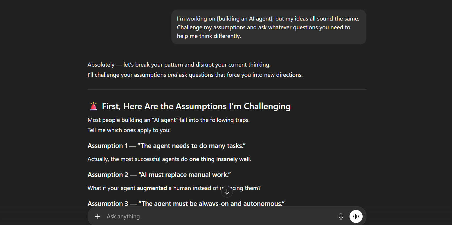 Pro Tip: For maximum breakthroughs, tell ChatGPT to intentionally challenge your assumptions. This forces the model to disrupt your current mental model instead of optimizing what you already think ✨