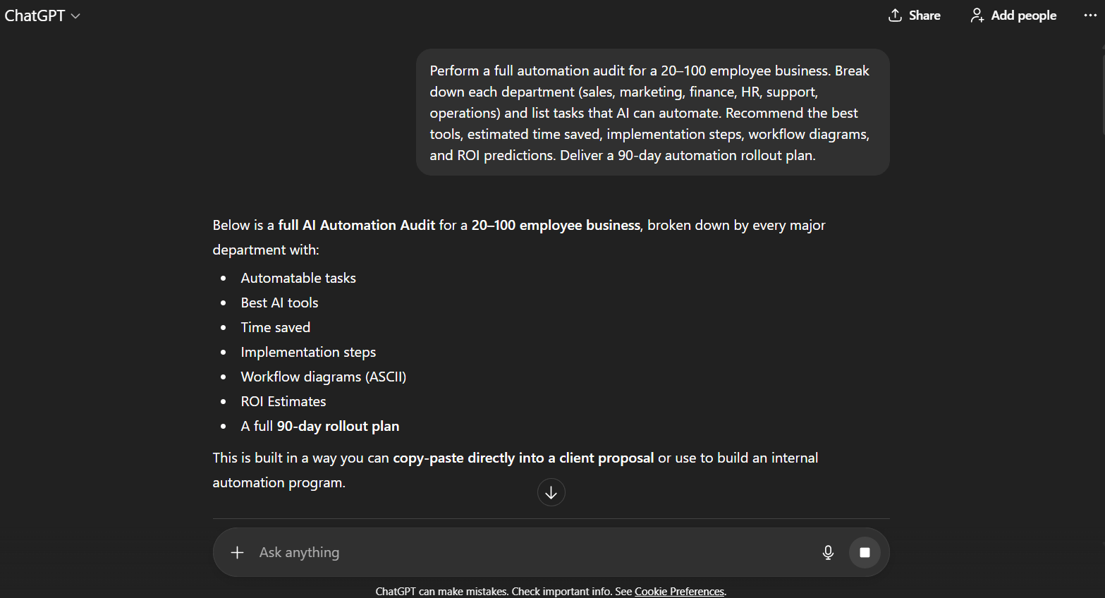 “Perform a full automation audit for a 20–100 employee business. Break down each department (sales, marketing, finance, HR, support, operations) and list tasks that AI can automate. Recommend the best tools, estimated time saved, implementation steps, workflow diagrams, and ROI predictions. Deliver a 90-day automation rollout plan.”