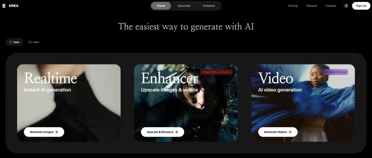 Visit Krea.ai, click the “AI Video Generation” tab, and you’ll enter the workspace where you can craft videos using prompts + images.